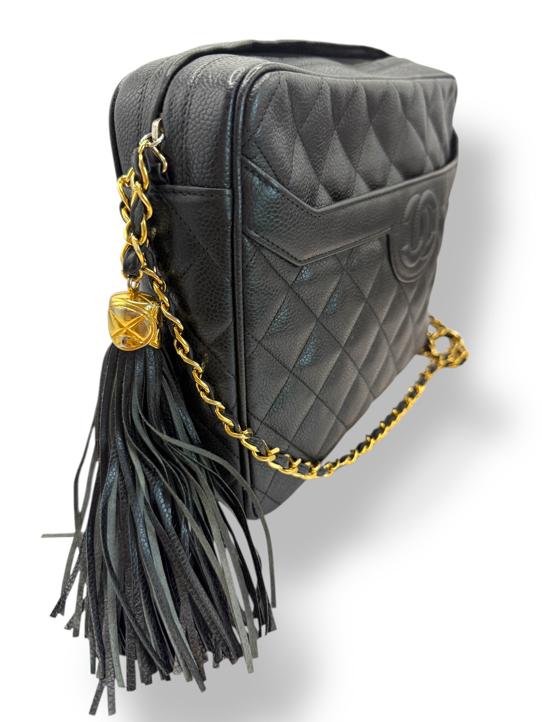 This Chanel Vintage Camera Bag has classic diamond quilted black caviar leather with gold-tone hardware and a leather-interwoven chain strap. Features the signature CC logo on the front pocket and an oversized leather tassel zip pull.